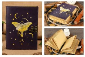 https://leatherjournalcraft.com/product/blank-spell-book-of-shadows-journal-with-lock-clasp-vintage-handmade-leather-luna-moths-and-morpho-butterfly-print-diary-prayer-pagan-witchcraft-supplies-wiccan-decor-notebook-daily-7-x-5-inches/