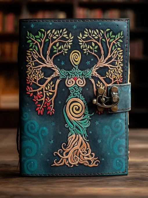 A beautifully designed brown top-grain leather journal with 200 pages of eco-friendly handmade paper. Featuring a mystical “Mother Earth” print, this journal is perfect for writers, Wiccans, and creative minds seeking a trusted magical companion.