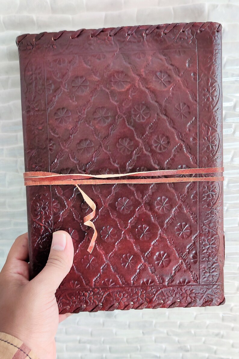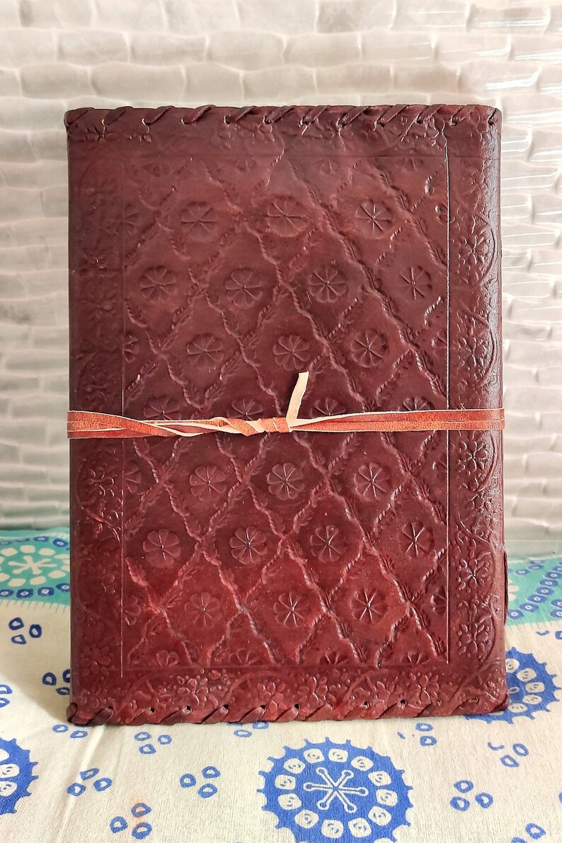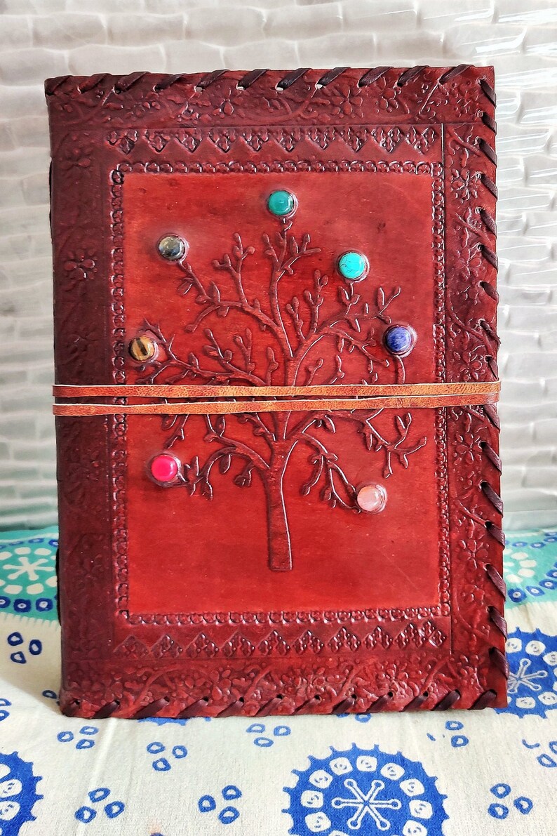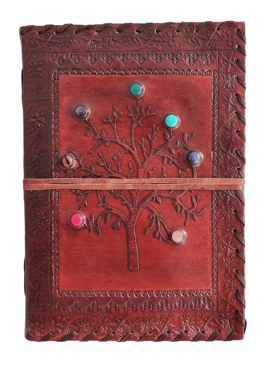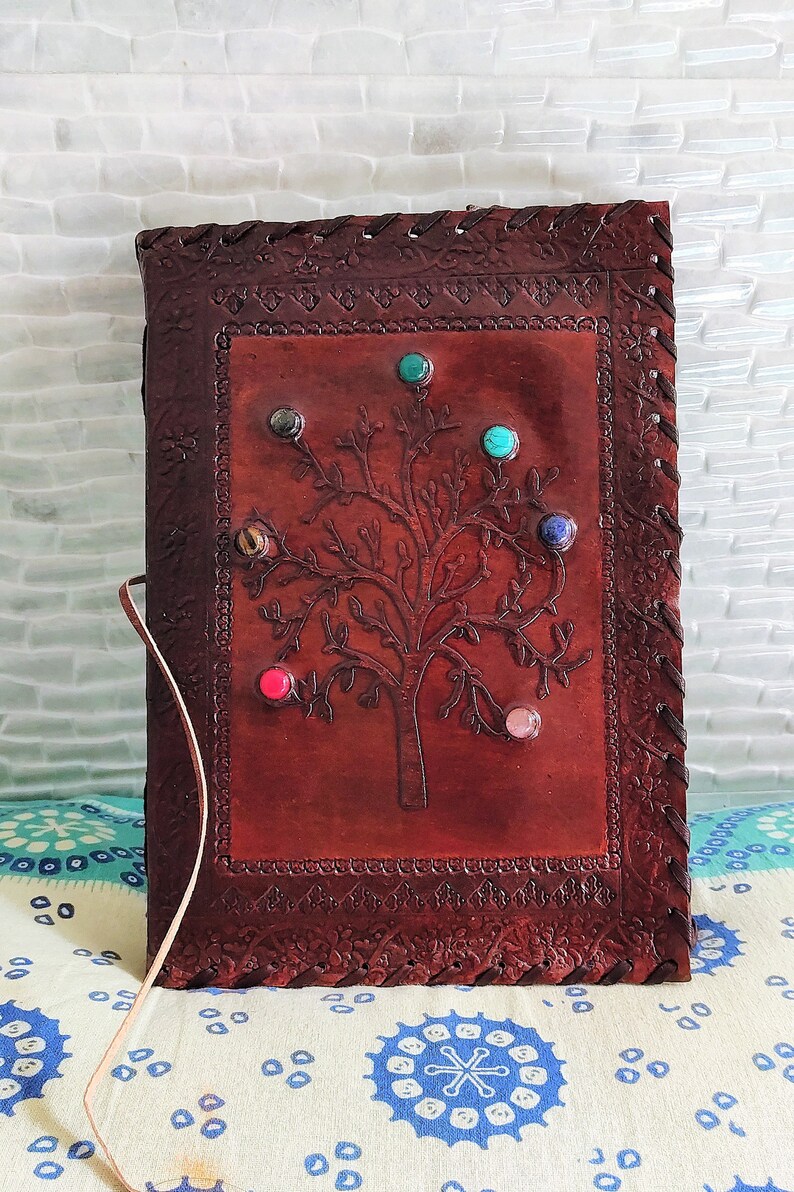 This Brown Colored Large Leather Journal features a beautifully embossed “Tree” design on the front cover, enhanced with small artificial stones that create the look of a fruit-bearing tree.
