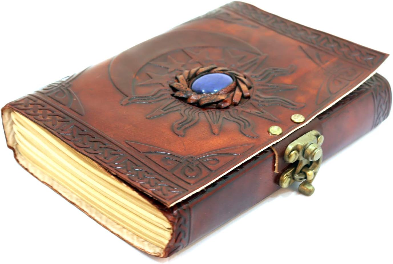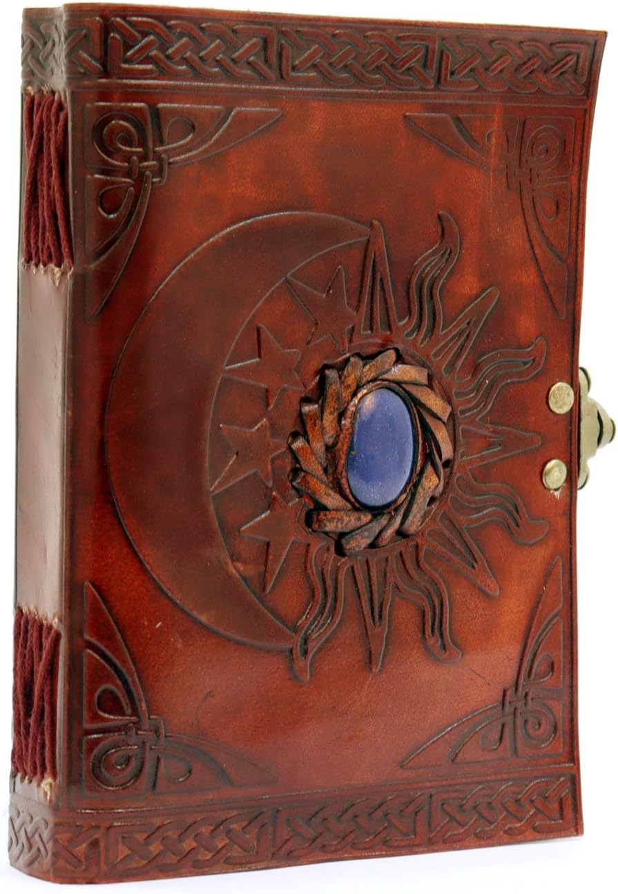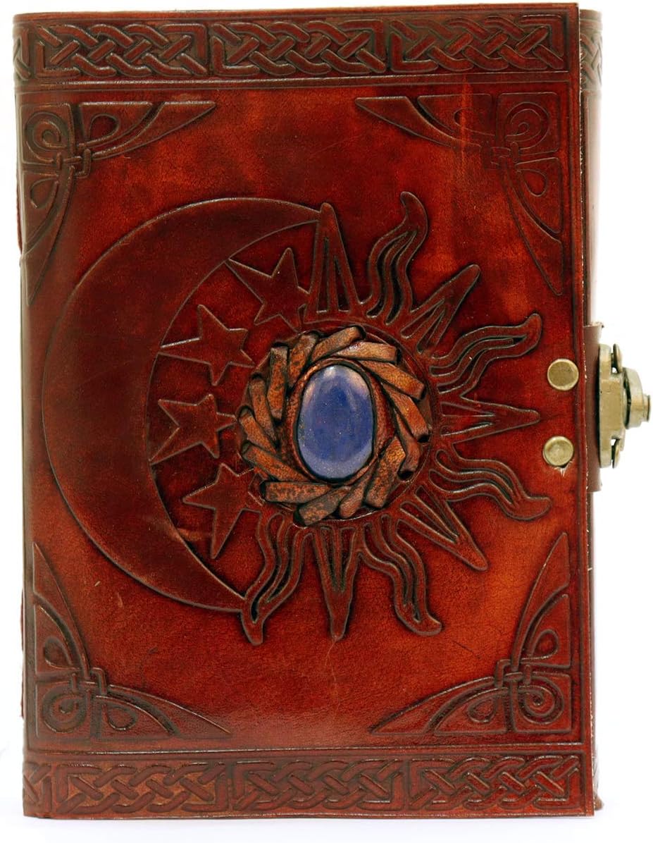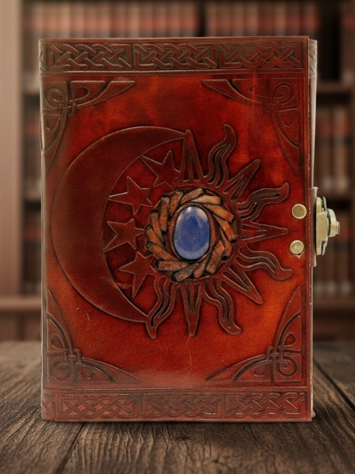 A beautifully handcrafted leather-bound journal embossed with a radiant Sun & Moon design and adorned with a blue stone centerpiece. Made from genuine top-grain leather, this timeless notebook features 180 unlined pages of thick kraft paper, making it the perfect companion for writing, sketching, or personal reflection. A keepsake journal built to last a lifetime.