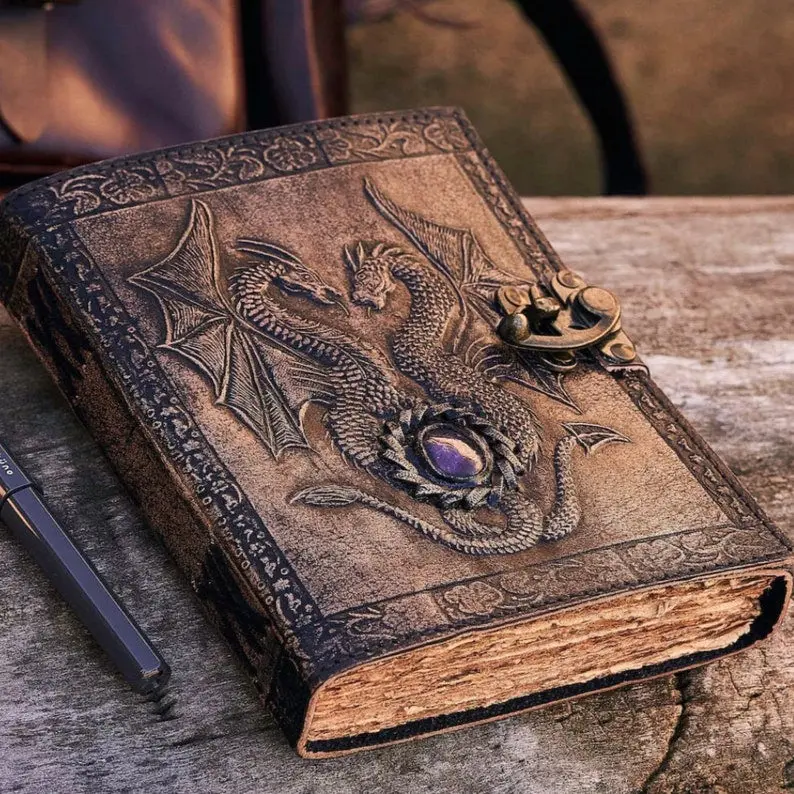 • Design: Premium vintage-style leather cover embossed with a double-dragon motif, accented with a central amethyst stone