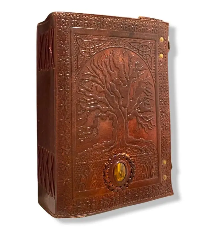 • Design: Vintage leather cover embossed with seven-stone chakra motif, artisan-crafted and secured with a lock clasp