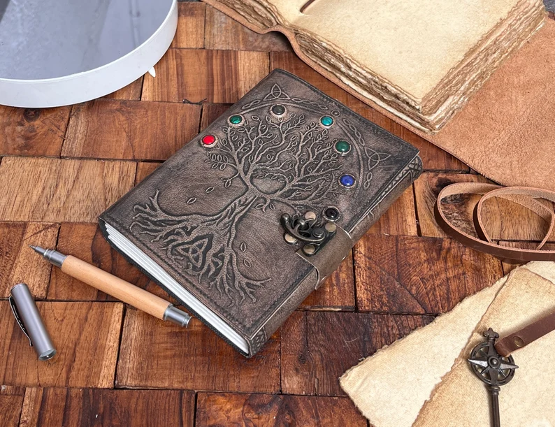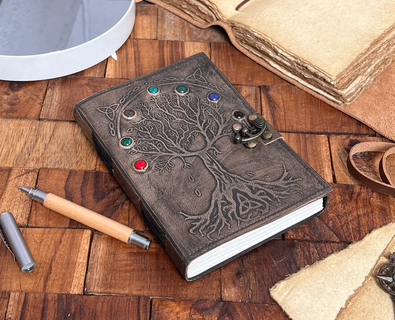 • Design: Vintage leather cover embossed with Tree of Life motif and adorned with seven colored chakra stones