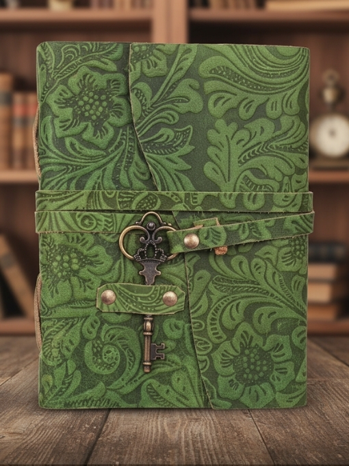 • Design: Vintage green leather cover with handmade finish and deckle-edge paper aesthetic